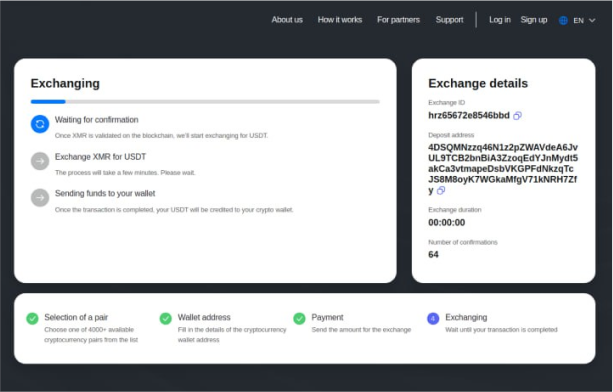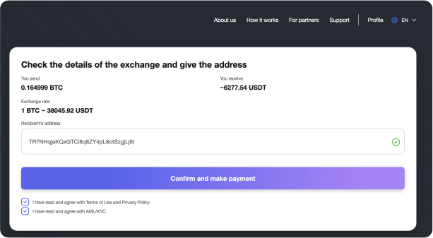 As soon as the system receives your cryptocurrency, it will automatically exchange it using the liquidity of cryptocurrency exchanges and instantly send it to the destination you specified. As all exchanges are made by the order book, our service doesn’t fix the exchange rate. The service calculator shows the expected rate. Also, this rate doesn’t take into account withdrawal fees from cryptocurrency exchanges. If the exchange is at a floating rate, it can only be recalculated downwards.
