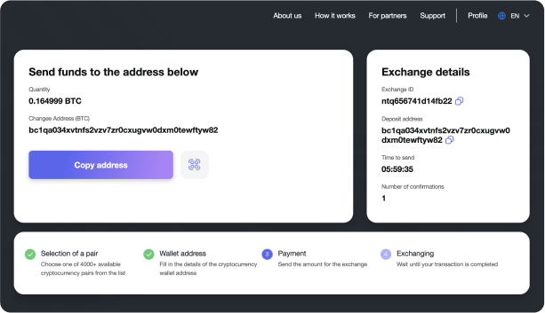 At this point, your application has been created. You’ll see the wallet address on a new page. You need to send to this address the cryptocurrency you want to exchange. The provided address will be fixed for this request within 6 hours. You have to send the funds before this time expires. After 6 hours, the address is removed from the reserve, and the application is reset. So if you sent funds after this time, please contact our technical support to solve the problem. Never re-send your funds to the address received within one application.